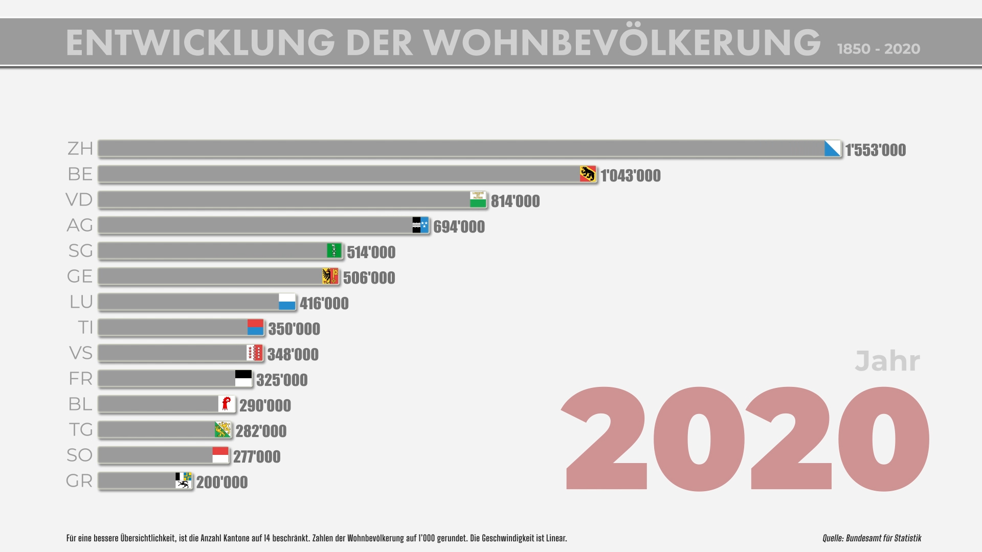 In diesem Beispiel ist die Einteilung wiederum in die Kantone, jedoch mit der entsprechenden Bevölkerungszahl und Jahrzahl. Deshalb habe ich mich entschieden, als Darstellungsform ein Balkenrennen zu wählen. D.h. die vertikale Reihenfolge wird von der Bevölkerungszahl gesteuert.
